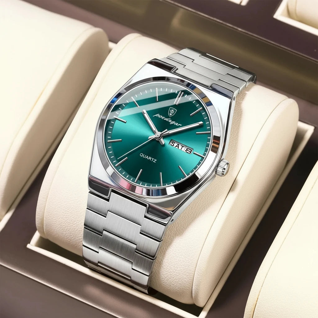 Équipée d’un mouvement quartz précis, cette montre propose affichage de la date et du jour, aiguilles lumineuses, et une étanchéité 3 Bar pour nager ou affronter la pluie. Son bracelet en acier inoxydable de 23 cm avec fermoir déployant à bouton-poussoir assure confort et sécurité.